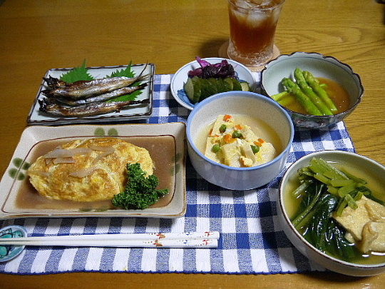 ししゃもの甘辛焼 豆腐の卵とじ ポテトサラダ 胡瓜とわかめの酢の物 春菊としめじの酢味噌和え eriSnapdish スナップディッシュID:ru9X0a。