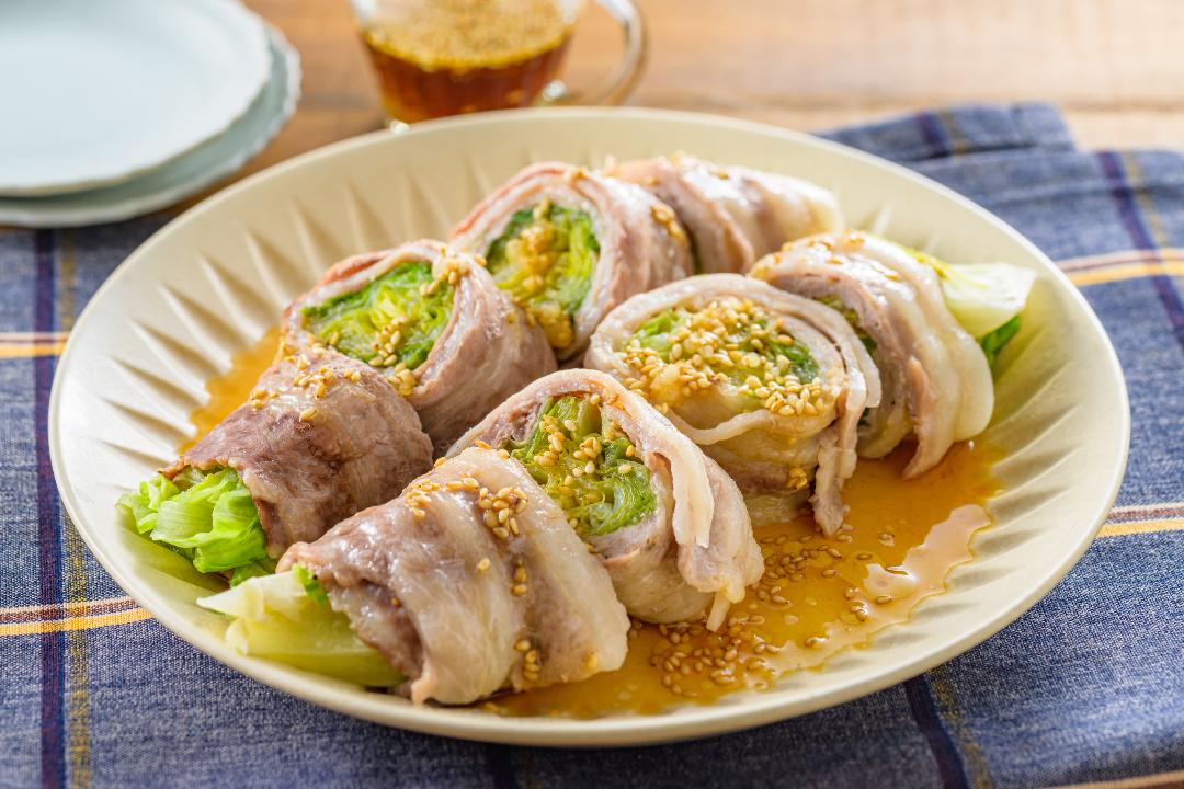 レタスのレンチン豚肉巻き やみつきだれ。
