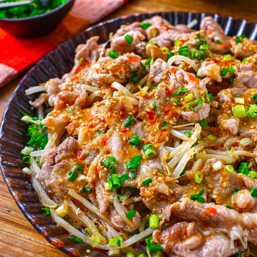 レンジで絶品☆豚こまもやしのレンチン蒸し♪濃厚ピリ辛ごまだれ。