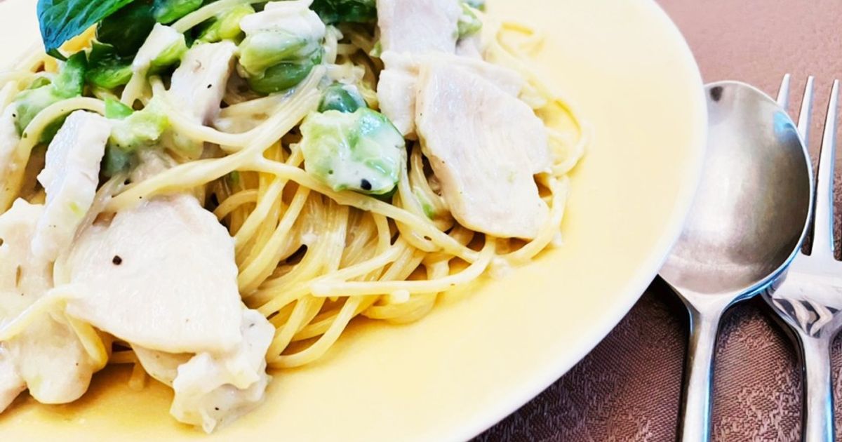 サラダチキンと焼きなすの冷製クリームパスタ。