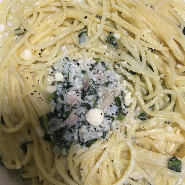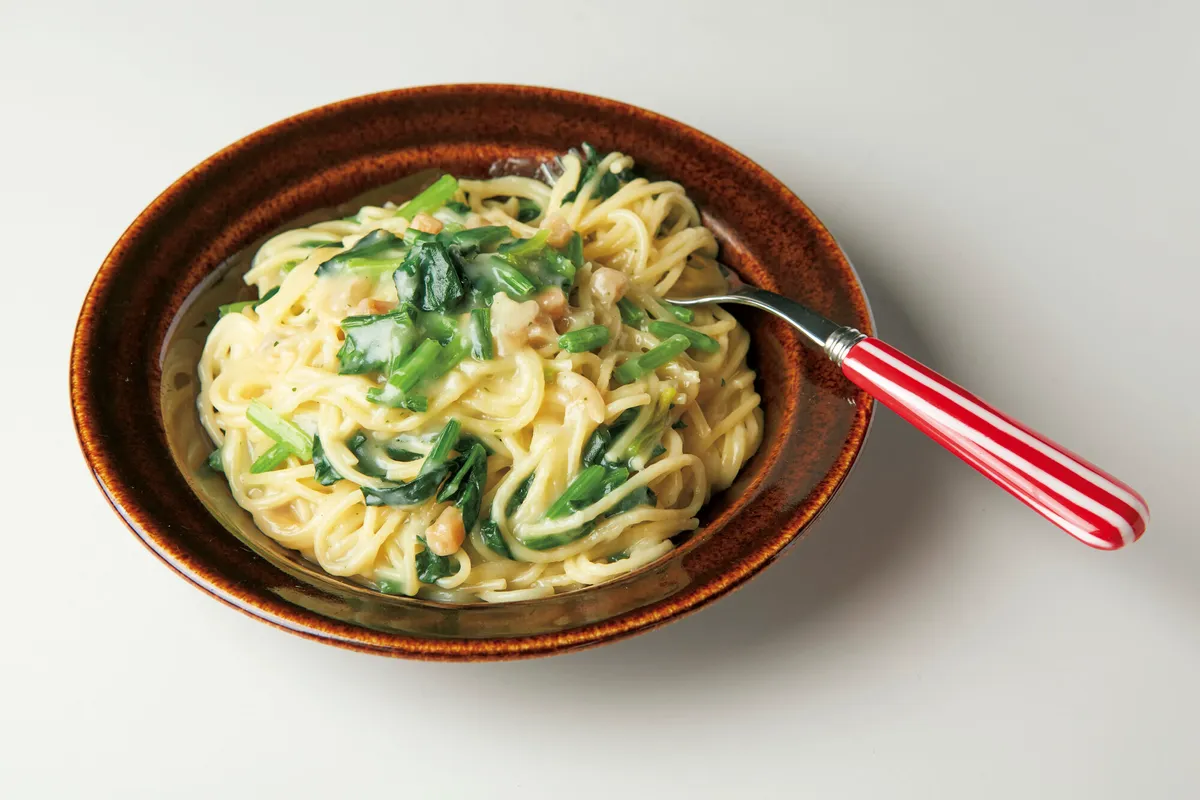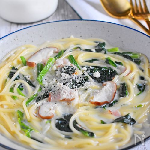 シコメル アレンジレシピ集 グリーンカルボナーラパスタ。