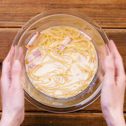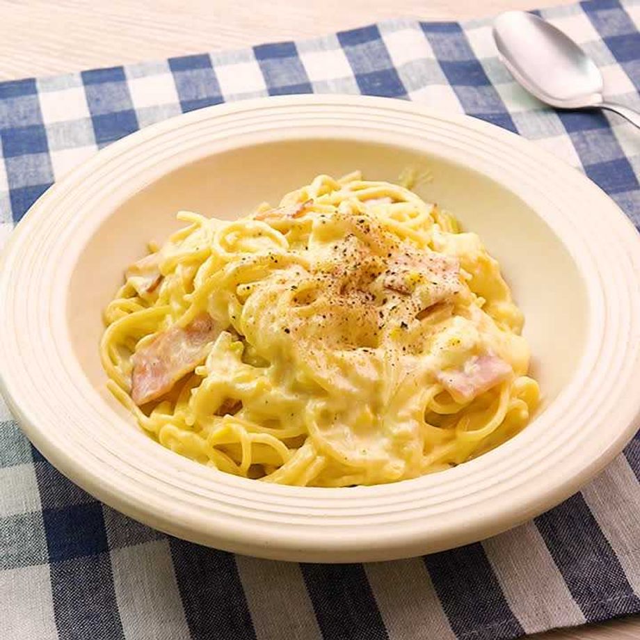包丁いらず混ぜるだけ!コーンスープの素で濃厚カルボナーラ! パスタ。