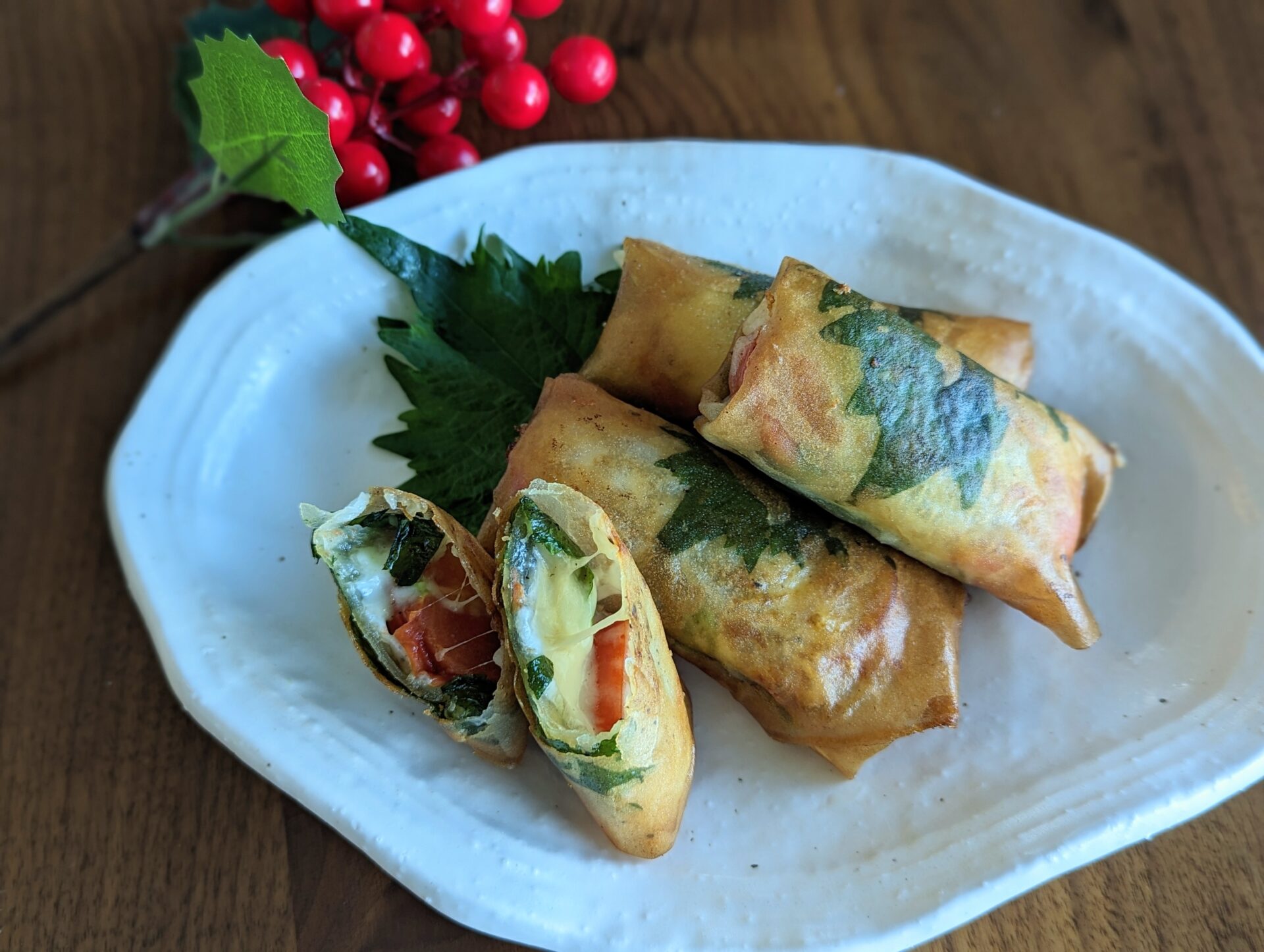 トマトと大葉のモッツァレラチーズ春巻き とろ~りチーズに爽やかな風味が美味しい☆虚弱体質なママでも美味しい酒が飲みたい。