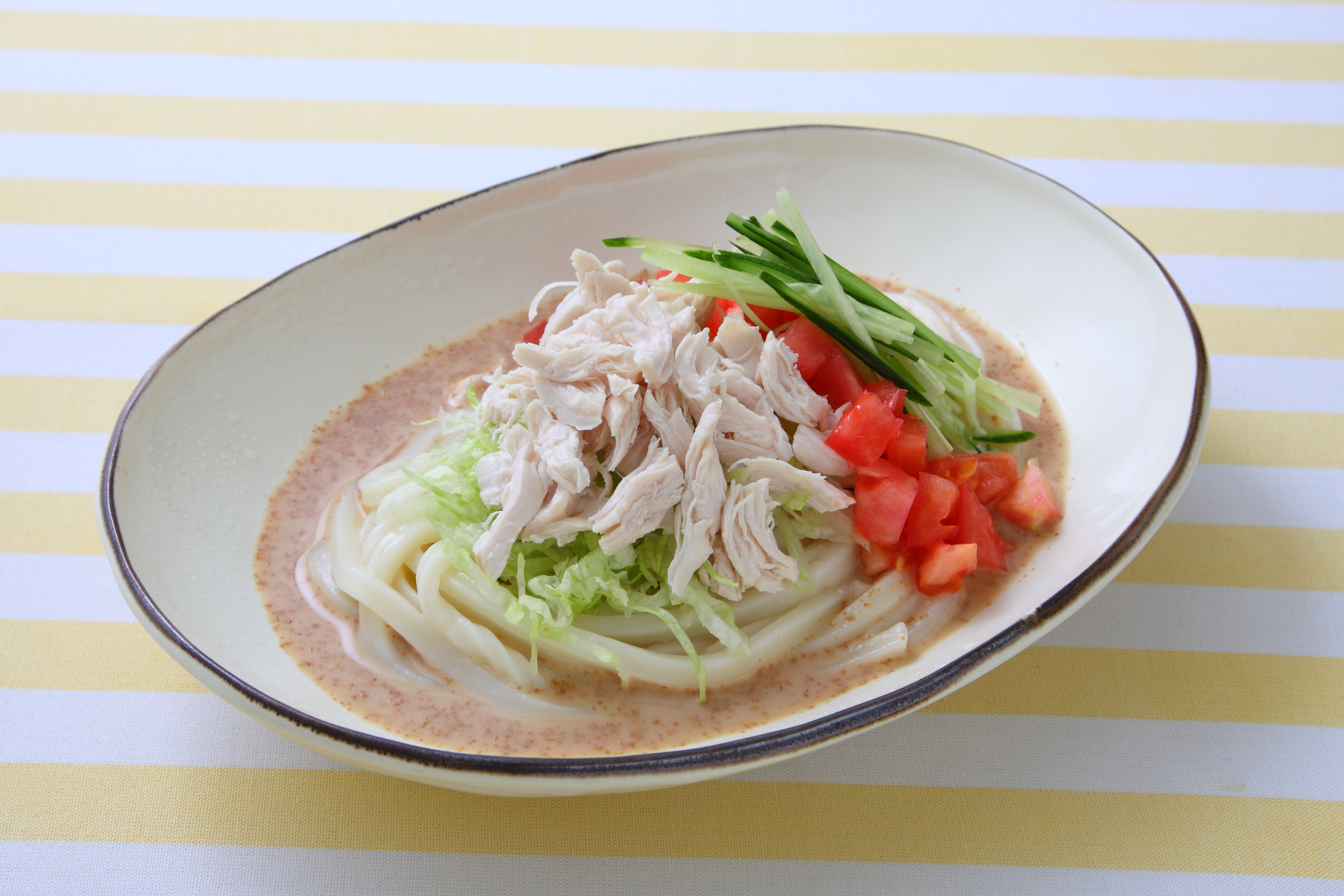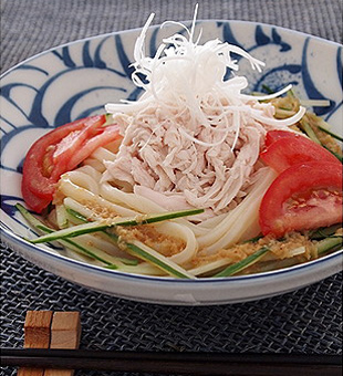 さっぱりうどんレシピ「バンバンジーうどん」。