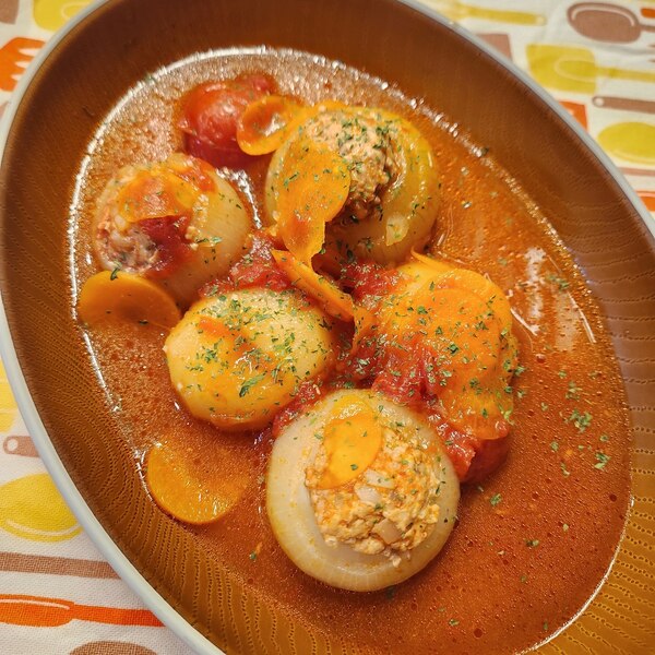 おかず 新玉ねぎの肉詰めトマトスープ。