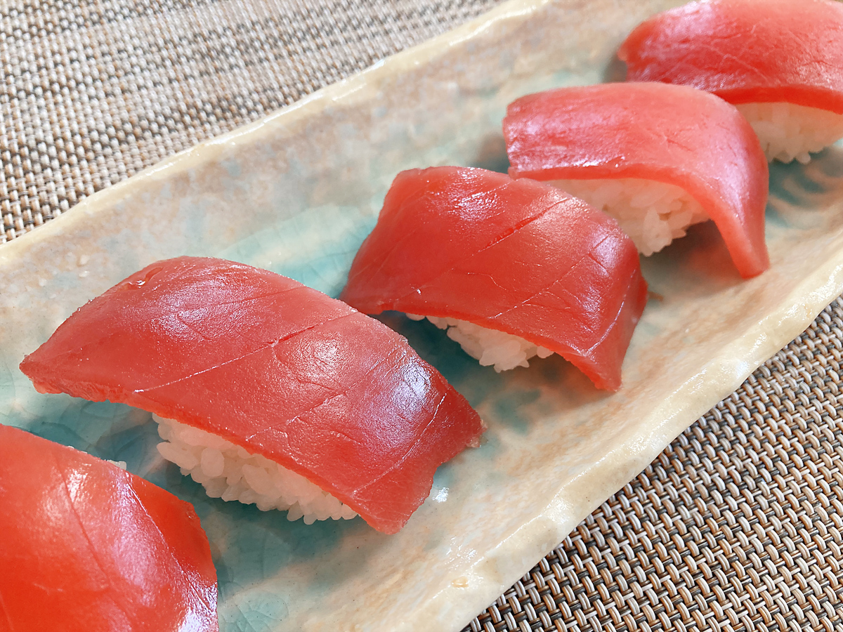 お寿司屋さん御免なさい!湯引き漬けマグロの握り寿司。