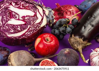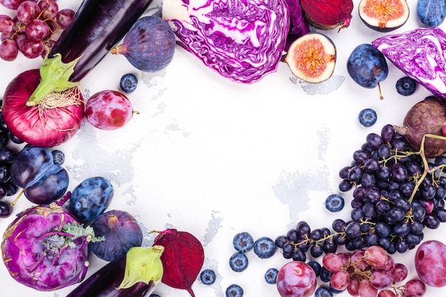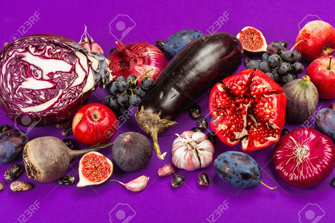 青、赤、紫の食べ物。果物と野菜の料理の背景。新鮮なイチジク、プラム、タマネギ、ナス、ブドウ、キャベツ、リンゴ、ニンニク、ハナミズキ、ザクロ。白い背景、トレンディなハードライトPremium写真。