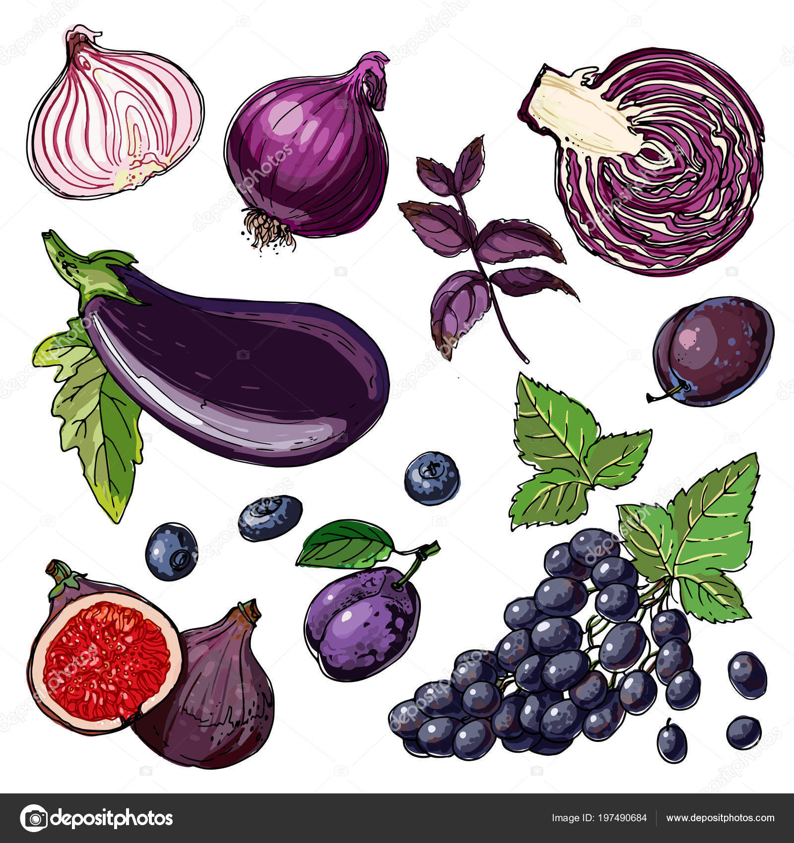 紫色の野菜や果物のセットです 白い背景の上に食べ物のベクトル カラー スケッチ ブドウ イチジク プラム キャベツ 紫タマネギ バジルストックベクター ©vaneevais.gmail.com 197490684。