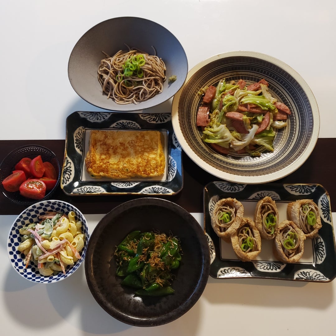 夕飯献立 暑い日に いろいろトッピングで茶そば子供ごはんJ'aime les chats☀お弁当ごはん。