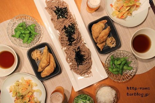 献立 年越し蕎麦、根菜の煮物、お漬物盛り合わせ、菜の花のマヨポン和え、焼き野菜の甘酢漬け、ビール : kajuの□今日のお料理・簡単レシピ□。