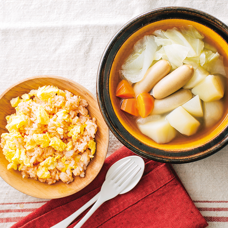 「野菜がいっぱいポトフ」&たまごケチャップライス 2人分。