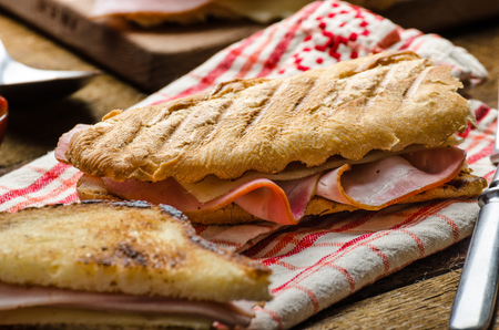 簡単な夕食は、トーストとハムとチーズのパニーニ、英語トースト、バター、フランス デザートおいしいチュロスの写真素材・画像素材 Image35383652。