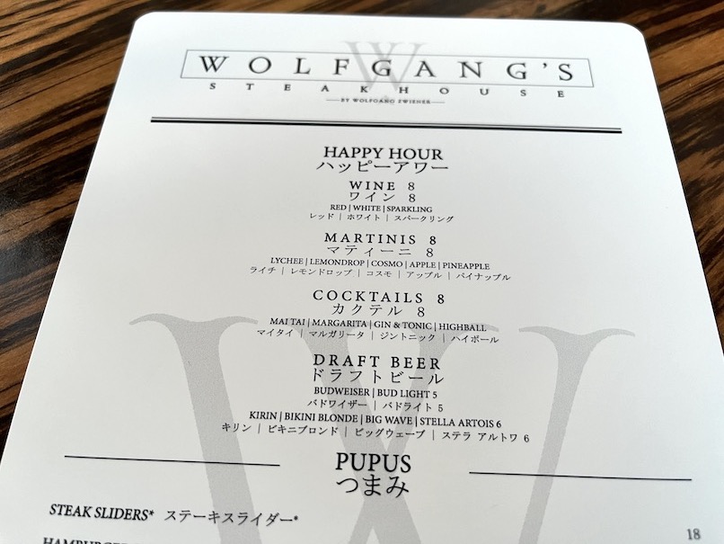 2024年 ウルフギャング ハワイのハッピーアワーメニュー全種類と価格ほかお金なくてもハワイに行きたい。