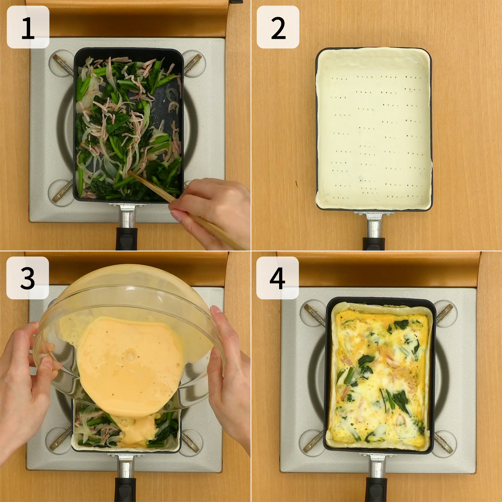 型なし!オーブンいらず! 卵焼き器でほうれん草の簡単キッシュ。