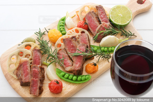 カッティングボードに盛り付けた牛肉と野菜のグリルの写真・画像素材-Snapmart スナップマート。