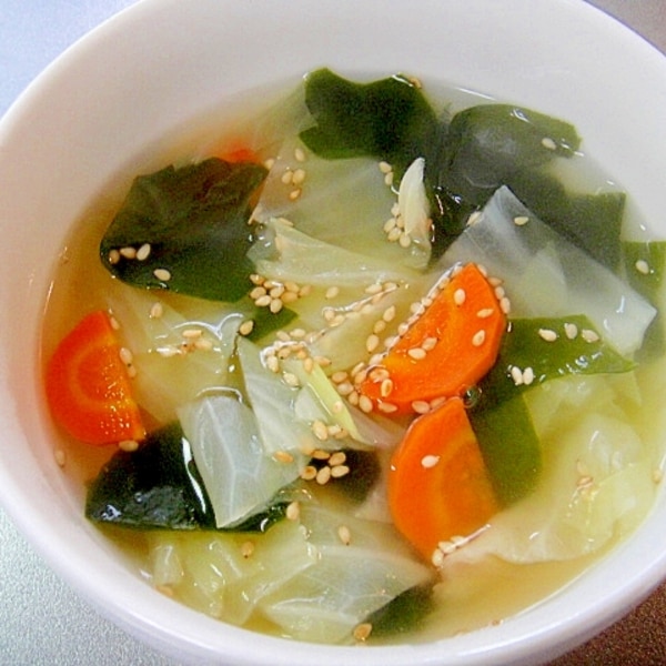 ほっとする優しい味♪ キャベツとにんじんの生姜中華スープ。