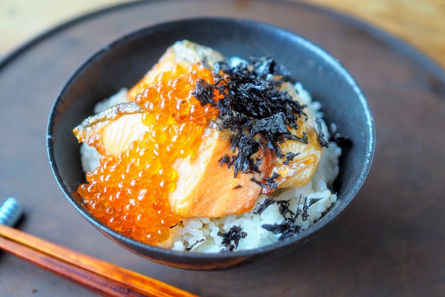ごはんが止まらない丼レシピ鮭の焼漬&イクラのっけ丼 中ざら糖で作るとおいしさ倍増!のっけて、食べる。