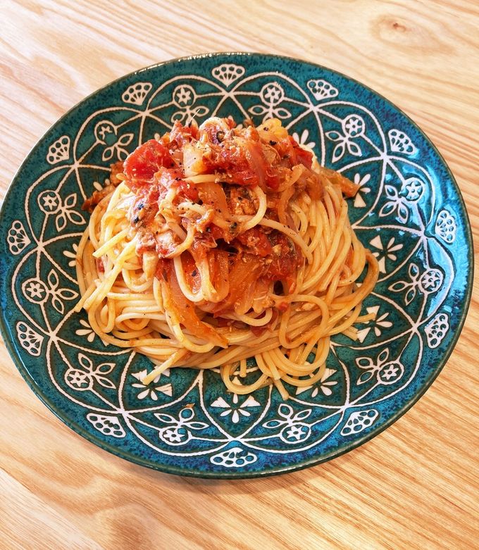 何度もおすすめしている、我が家の人気No.1パスタ!味付けは塩と砂糖だけ、トマトとにんにくが主役です☺️🍝。