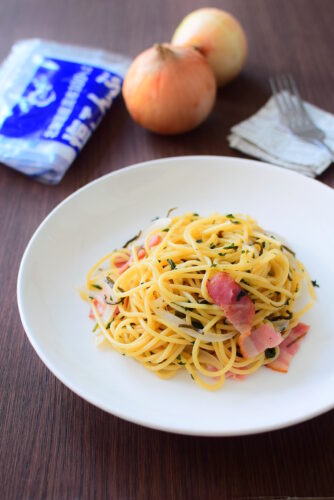 塩昆布で簡単に!ベーコンと玉ねぎの和風パスタ。