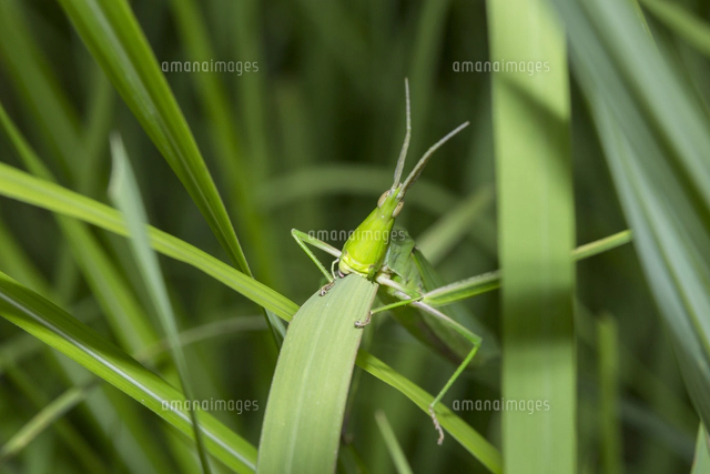 ショウリョウバッタ、ススキの葉を食べる 32053017010 の写真・イラスト素材アマナイメージズ。