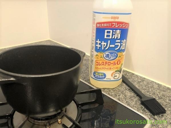 やっとストウブが届いた!, 今すぐ使いたいけど、まずは油でシーズニングしないと!,中の全体に油をつけてシーズニングをすると、食べ物が簡単に焦げつかないし、錆にならないように守ってくれる。, 必ずやってくださいね。,料理に使った後にも時々またシーズニングをした方がいいと言われている。, どの油を使うのも大事なので、僕は米油を塗りました。,発煙点が高く、香りも強くないからオススメです。,。