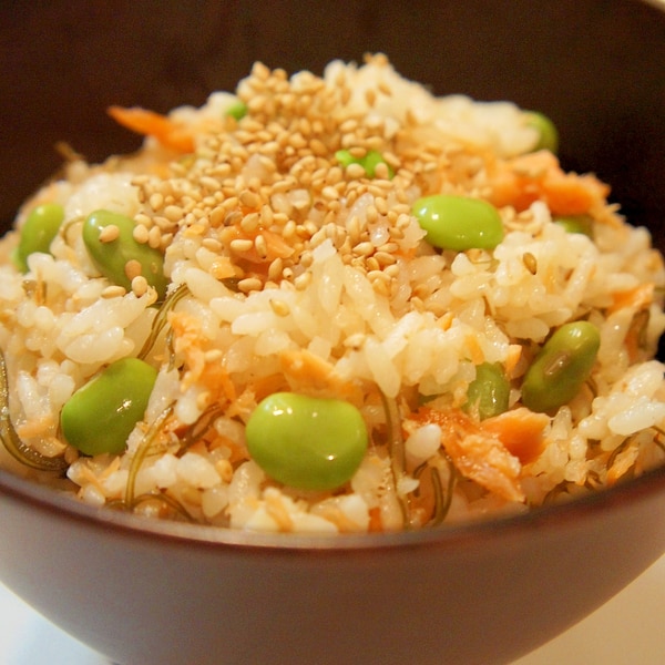 昆布の風味香る♪鮭と冷凍枝豆の混ぜご飯。