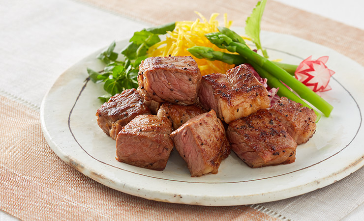 やわらか サイコロステーキ - レシピ - 果実のチカラでおにくやわらか 梅ソフト - KITII株式会社キティ。