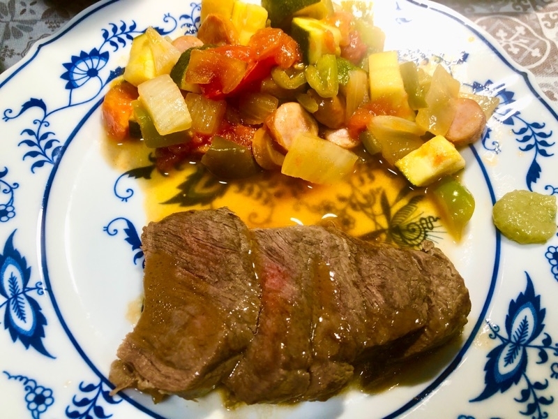 赤身のステーキはワサビを添えて 夏野菜のラタトゥイユを付け合わせに - 糖質オフのおうちごはん~持病があっても楽しく生きる~。