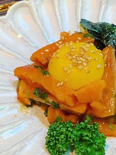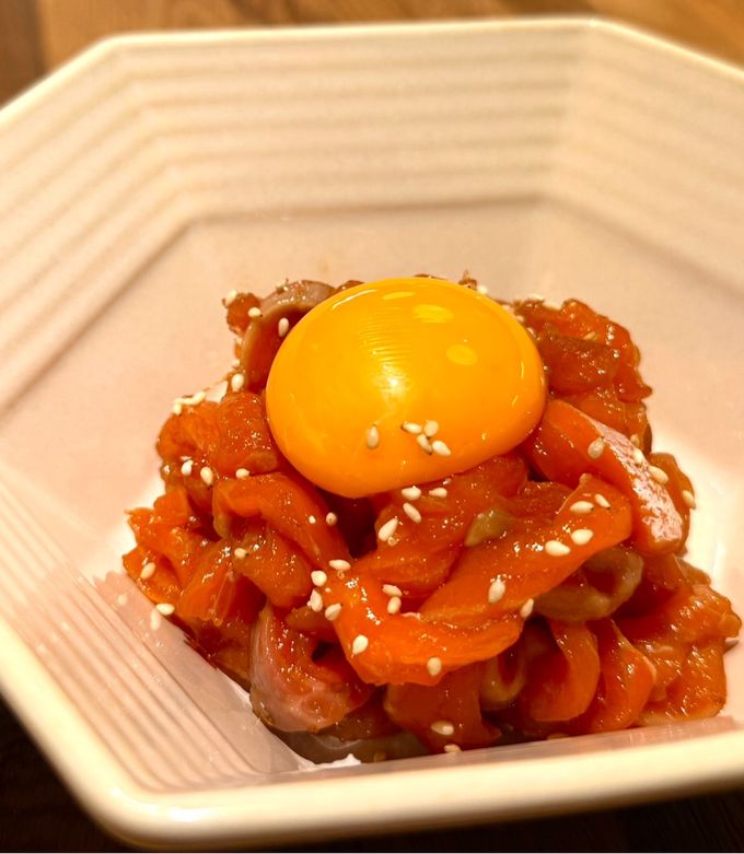 ハマごはん お手軽レシピon X: " 究極のサーモンの焼肉ユッケ①サーモンを細切りにする ②サーモン、焼肉のたれ、にんにく、生姜、ごま油を混ぜて30分以上漬ける④白ごまを加えて和える ③大葉を添えて卵黄、ネギをのせて完成 https:t.co 013GPb7WUk"X。