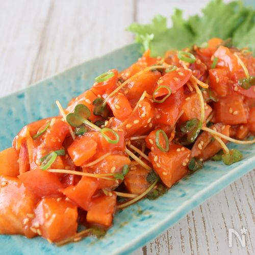 簡単おつまみ☆ごろっとサーモンユッケ。