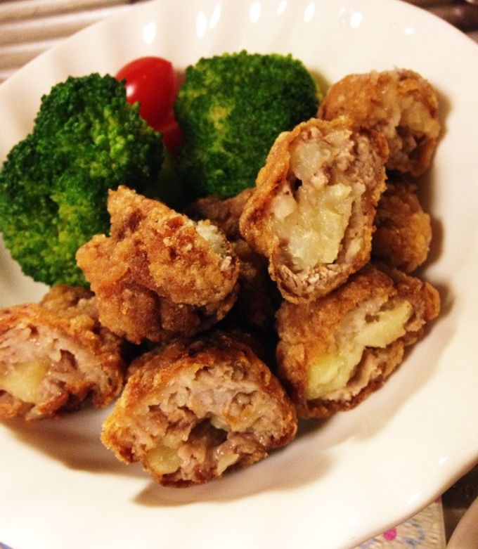 ボリューム満点♪ 新じゃがと豚肉のカレーチーズ揚げ。