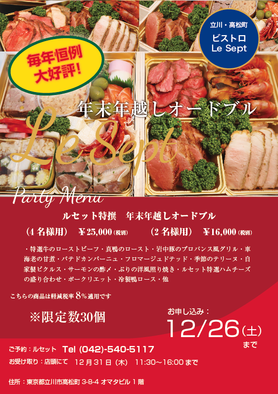 2020~2021年年末年越しオードブルのご案内』 - Le spet chez IINA ル・セットシェイイナ 立川のワインがおいしいフレンチレストランお弁当・テイクアウトも大人気。