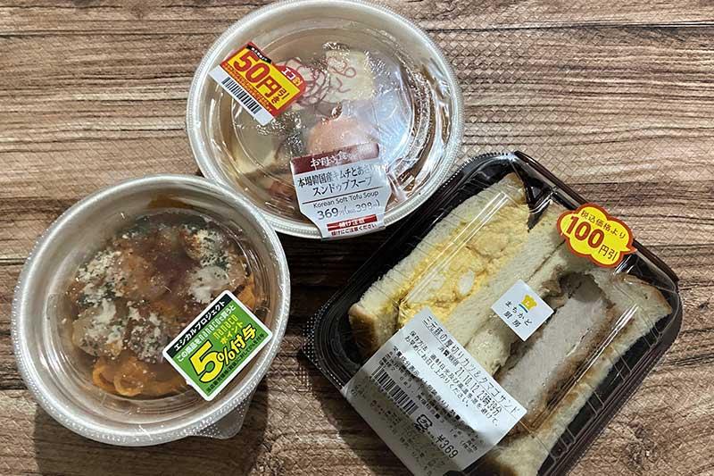 初めて知った いいこと聞いた コンビニって半額になるんだ 3点買って1000円いかないって こりゃ安いわ 今、コンビニ弁当お高いからねローソン。