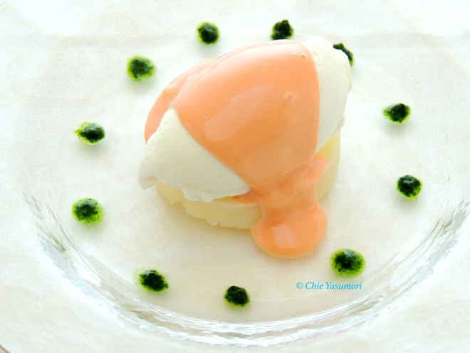 ポーチドエッグのオーロラソース・ポテトピュレ添え 介護食クリコのふわふわ介護ごはん。