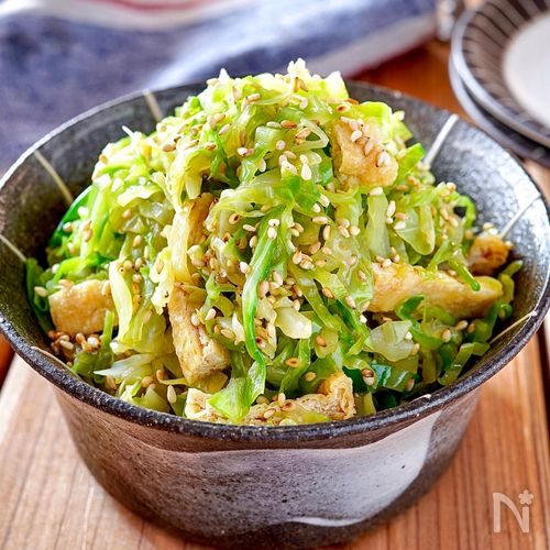 ごま油香る♪簡単ヘルシー和風副菜🇯🇵茹でキャベツと油揚げを めんつゆベースだれで 和えるだけの簡単副菜です🥢ごま油の香りと味の染みた油揚げが お口の中でじゅわっと広がり とっても美味しいです ^^ ︎👍🏻 ̖́- ヘルシーでいくらでも食べられちゃう1品ですよ。
