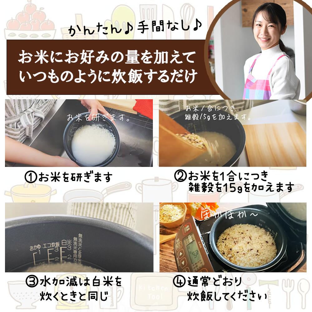 食感楽しむもち玄米」の炊飯方法 お好みの雑穀量で白米と混ぜて炊飯する場合レシピはくばく。