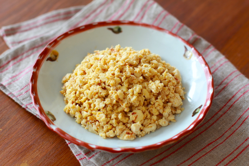 大豆製品アレンジレシピ第4弾 ピリ辛煎り豆腐のおから鶏そぼろ丼。