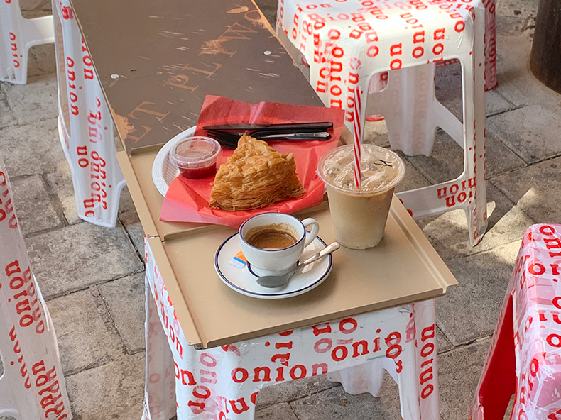 ← 🗣他の韓国情報はこちら \ cafe onion広蔵市場ソウルで有名な cafe onion が 8月広蔵市場にNew Open。OPENの11時前に行ったら行列で、 15分ほど待ちました。 イートインの席数は多くないのですが、 半分はテイクアウトしてる印象。 注文したもの・pastry。