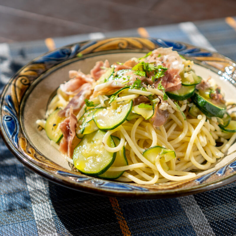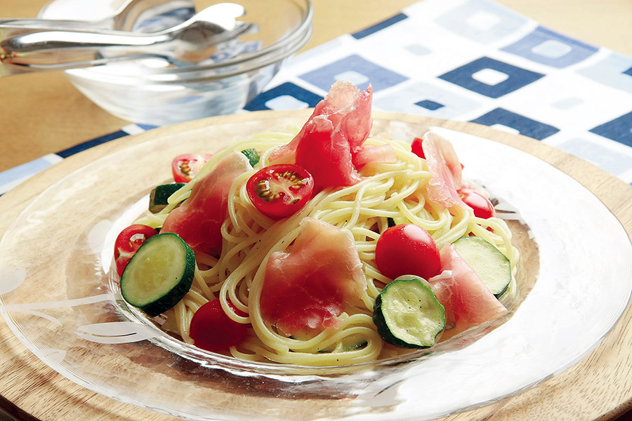 生ハムとズッキーニの冷製パスタハニーレモン風味。