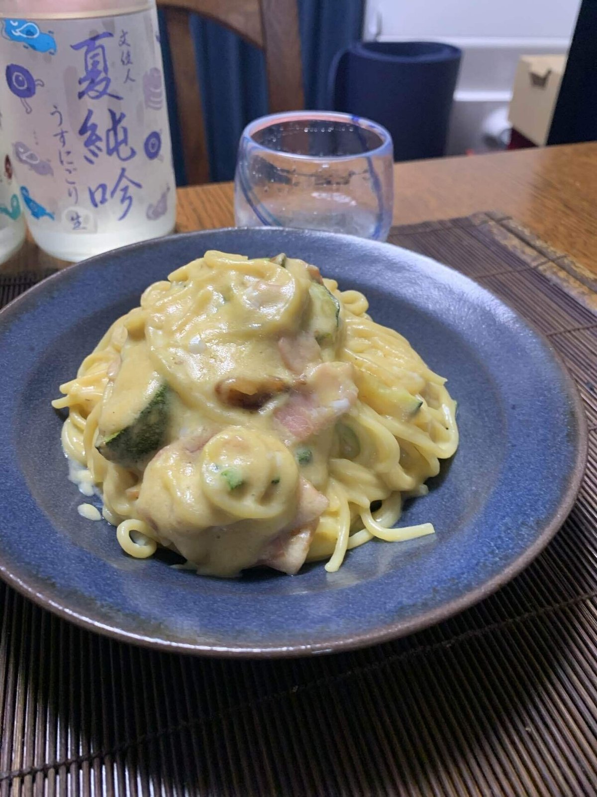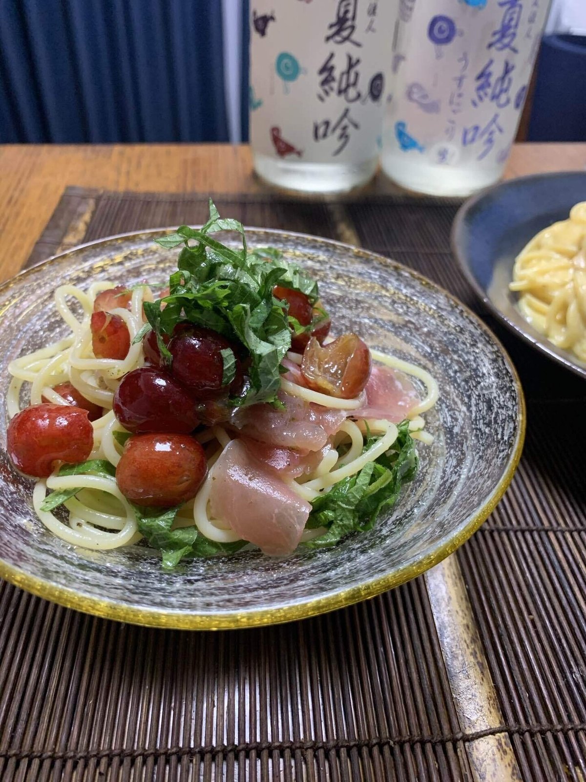 さくらんぼと生ハムの冷製パスタ、ズッキーニとベーコンの豆乳クリームパスタで夏酒を酔いどれんぬ。