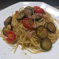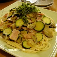 Linguine con zucchini e bacon, ズッキーニとベーコンのパスタ, YouTubeに動画を投稿しました!,詳しいレシピはYouTubeの最新動画をご覧ください!,きょう何たべよズッキーニpasta。