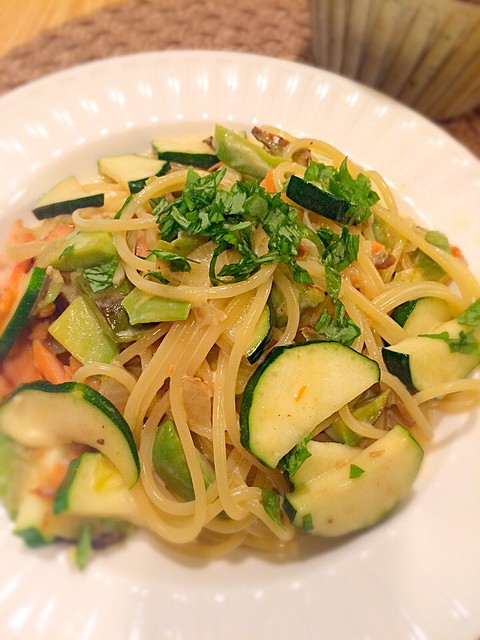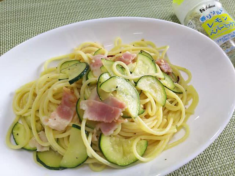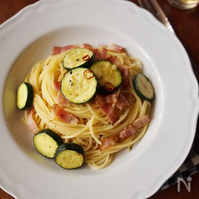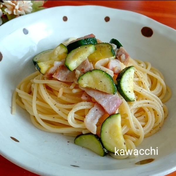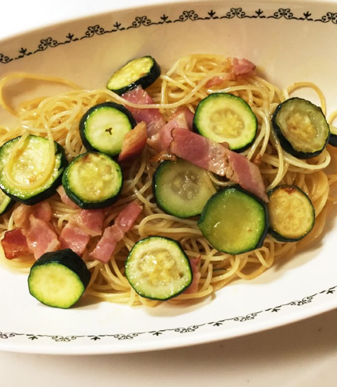 簡単おいしい! ズッキーニとベーコンのオイルパスタ。