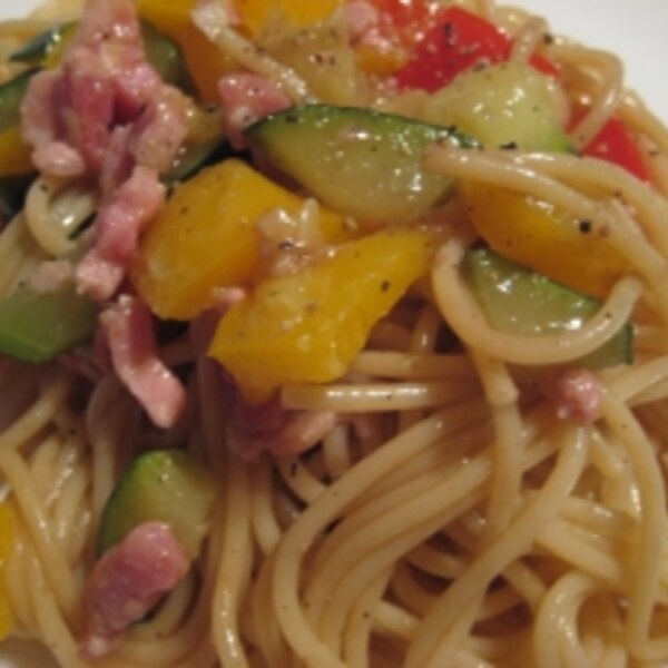 ズッキーニとベーコンの冷製ベジヌードルサラダ。