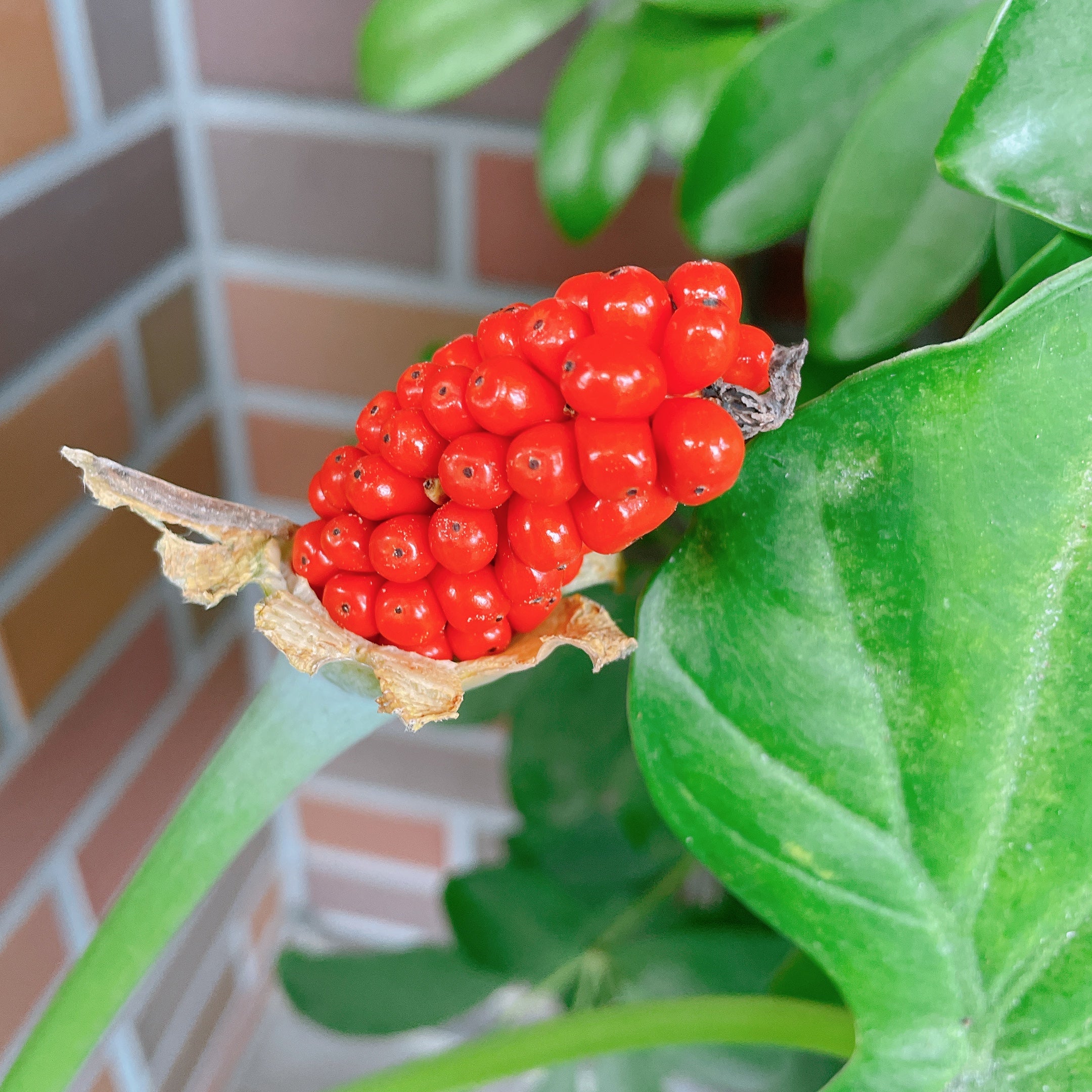 クワズイモの実👀 長らく育てていますが、結実したのは初めてです。 これを撒けば、発芽するのですかね🧐更なる繁栄を祈って、親株の根元に撒いておこうと思います☺️クワズイモアロカシアオドラ熱帯植物南国植物。