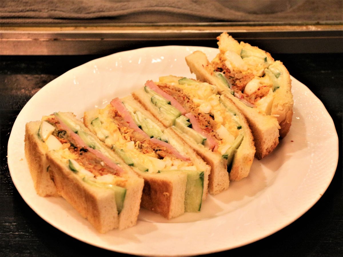 🥪 鶴橋コリアンタウン名物 珈琲館ロックヴィラの特製キムチサンド ¥700色とりどりの具材🥚🥒🥓とマヨネーズに キムチがしっくり馴染んだ絶妙のお味「クセになるやつ」です👍 サイフォンで1杯ずつ淹れてくれるコーヒーも美味 Kimchi Sandwich in Tsuruhashi鶴橋。