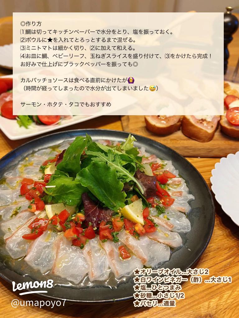 基本のレシピシリーズ 👩🍳🍾 サーモン、たこ、ホタテでも🙆♀️基本の鯛カルパッチョ簡単で絶品玉ねぎマリネも美味しい Nadiaレシピ ID:481723 - ̗̀ෆ𓏲𓎨-—————————∞ レシピサイト。