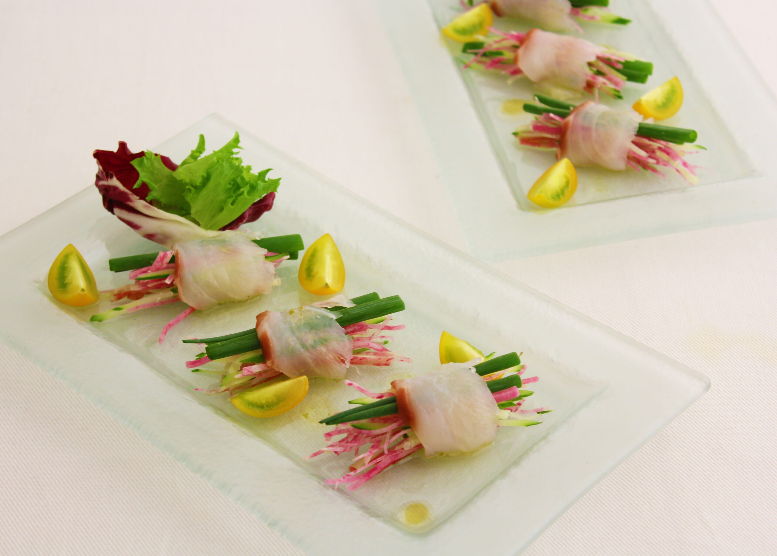 鯛の昆布じめとカラフルトマトのカルパッチョ。