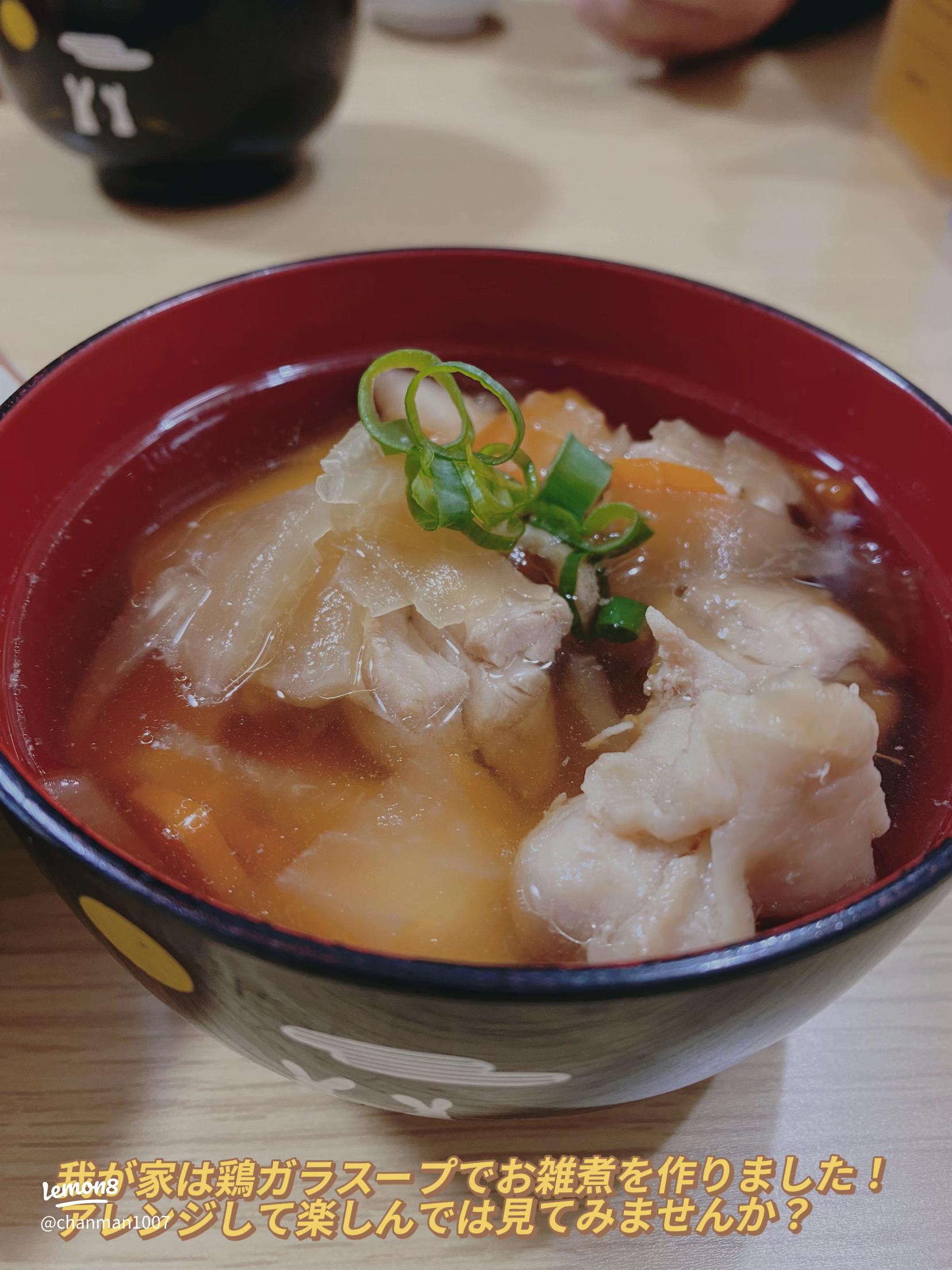 ロティサリーチキンのサムゲタンスープ』 ①ロティサリーチキンの身を骨から取りほぐす ②水 500ml 入った鍋に身と骨を入れ強火で5分煮込む③赤飯おにぎり 2 個を鍋に入れる ④おろし生姜小さじ1、切った長ネギ1 3本、白だし大さじ1と1 2、ごま油 大さじ1、塩コショウ。