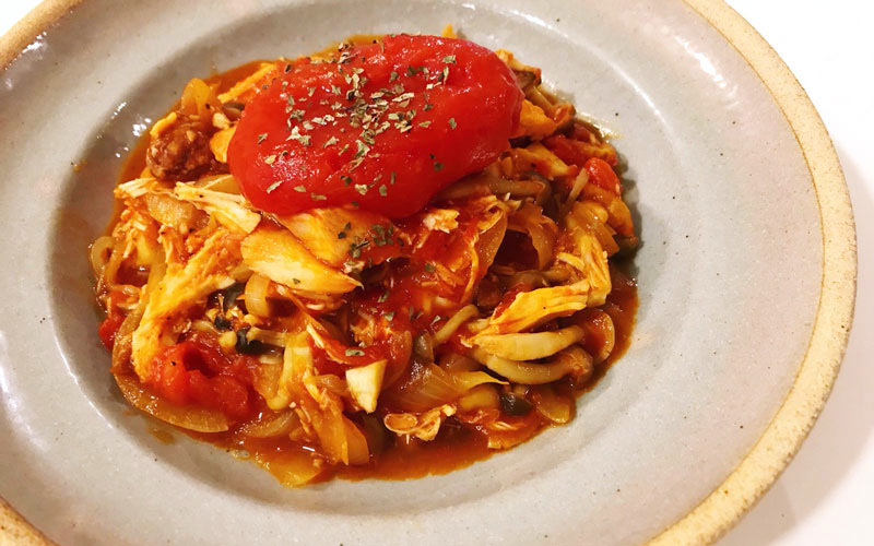 コストコ 人気商品ロティサリーチキンをアレンジ!「トマト煮込み」で節約時短♡Oggi.jp。