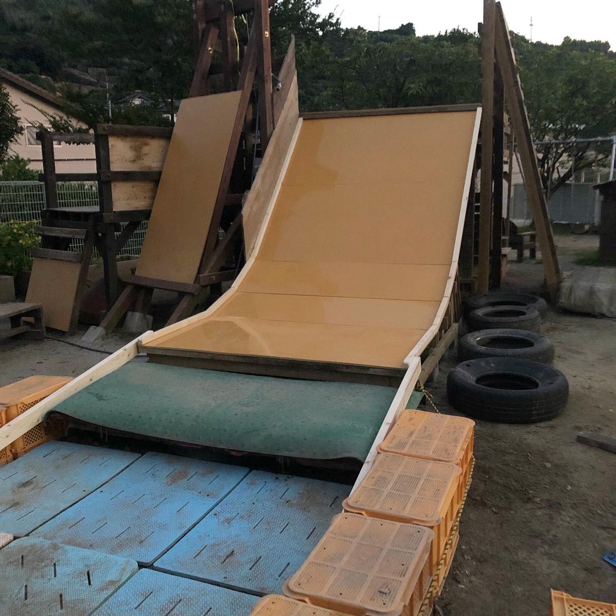 からたちこどもえん@熊本 on X: "大型滑り台の補修板の張り替え➕ウォータースライダー仕様にし、登り口側の床面の釘が浮いてきてしまうようになったので、全て釘を抜いてビスで止め直しました。・とにかく暑かった〜😅diy手作り遊具園庭遊具ウォーター。